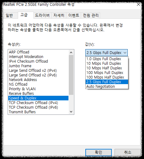 안에 Speed& Duplex 를 누르고